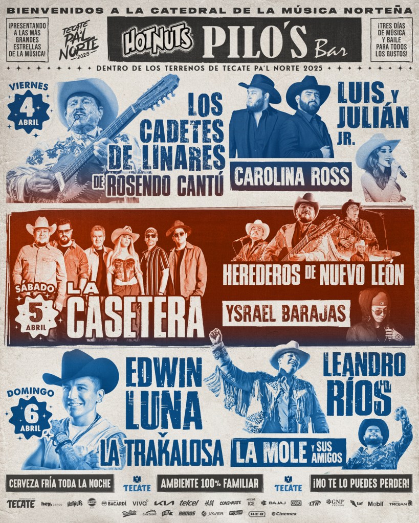 En el corazón de Tecate Pa’l Norte late un rincón lleno de tradición y sentimiento: el Escenario Hot Nuts Pilo’s Bar. Aquí, la música regional mexicana encuentra su hogar, resonando con la pasión y autenticidad que han convertido al género en un símbolo de identidad. Con su atmósfera cálida y festiva, este espacio recrea la esencia de los bares norteños donde la música y el baile nunca paran.