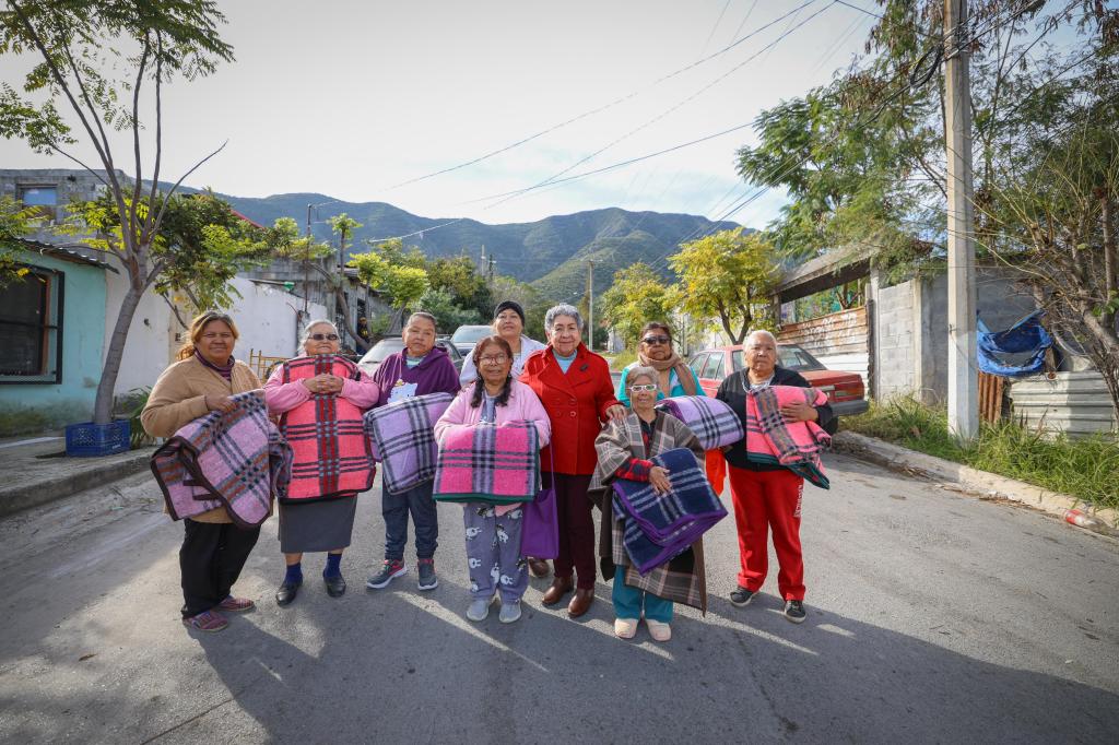 La diputada Maestra Reyna Reyes, del distrito 22 de Juárez, Nuevo León, junto a su equipo de trabajo, realizó una visita a la colonia Bosques de San Pedro, ubicada a las faldas del Cerro de la Silla en Juárez, Nuevo León. Durante esta jornada, entregaron cobijas a los adultos mayores de esta comunidad, como parte de un esfuerzo por mitigar los efectos del intenso frío que afecta a la región.