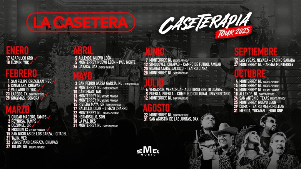 ¡Prepárate para vivir el mejor espectáculo de música retro del momento! La Casetera, una de las agrupaciones más solicitadas en México y Estados Unidos, anuncia su gira Caseterapia Tour 2025. Con su ritmo, energía y ese ambiente de fiesta único, la banda recorrerá las ciudades más importantes de ambos países, ¡y no te puedes quedar fuera!