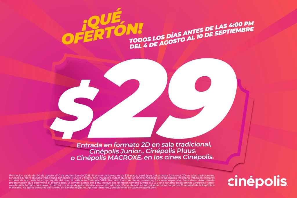 Durante este periodo, se podrán adquirir boletos por $29 MXN, para funciones 2D en salas tradicionales, así como en formatos Macro XE®, Cinépolis Pluus® y Cinépolis Junior®. También, se suma a esta promoción el Combo Cuates para Llevar, con un costo de $199 MXN, el cual incluyedos refrescos jumbo y una canasta de palomitas Cinépolis® sabor mantequilla tamaño para llevar.