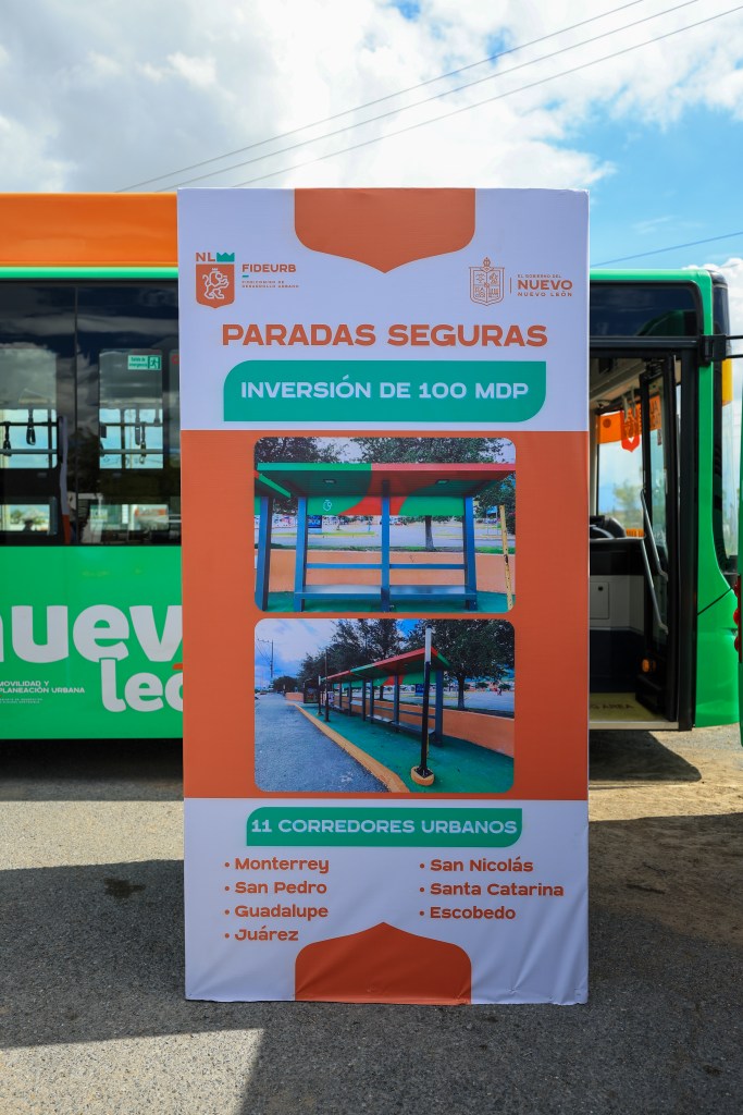 Además, la directora del Fideicomiso de Desarrollo Urbano (FIDEURB), María Guadalupe López Marchán, anunció la instalación de 500 parabuses en 11 corredores urbanos de municipios como Monterrey, San Pedro, Guadalupe, Juárez, San Nicolás, Santa Catarina y Escobedo.
