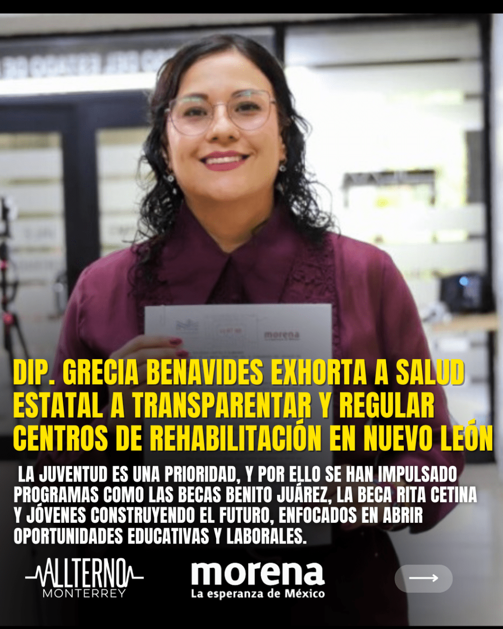 Monterrey, N.L.— La diputada Grecia Benavides Flores, integrante del Grupo Legislativo de Morena, presentó ante la Oficialía de Partes del Congreso del Estado un exhorto dirigido a la Secretaría de Salud de Nuevo León para que informe si existe un padrón público y actualizado de centros de rehabilitación, conocidos comúnmente como “anexos”, y qué acciones realiza el Consejo Estatal Contra las Adicciones para prevenir, tratar y erradicar la farmacodependencia.